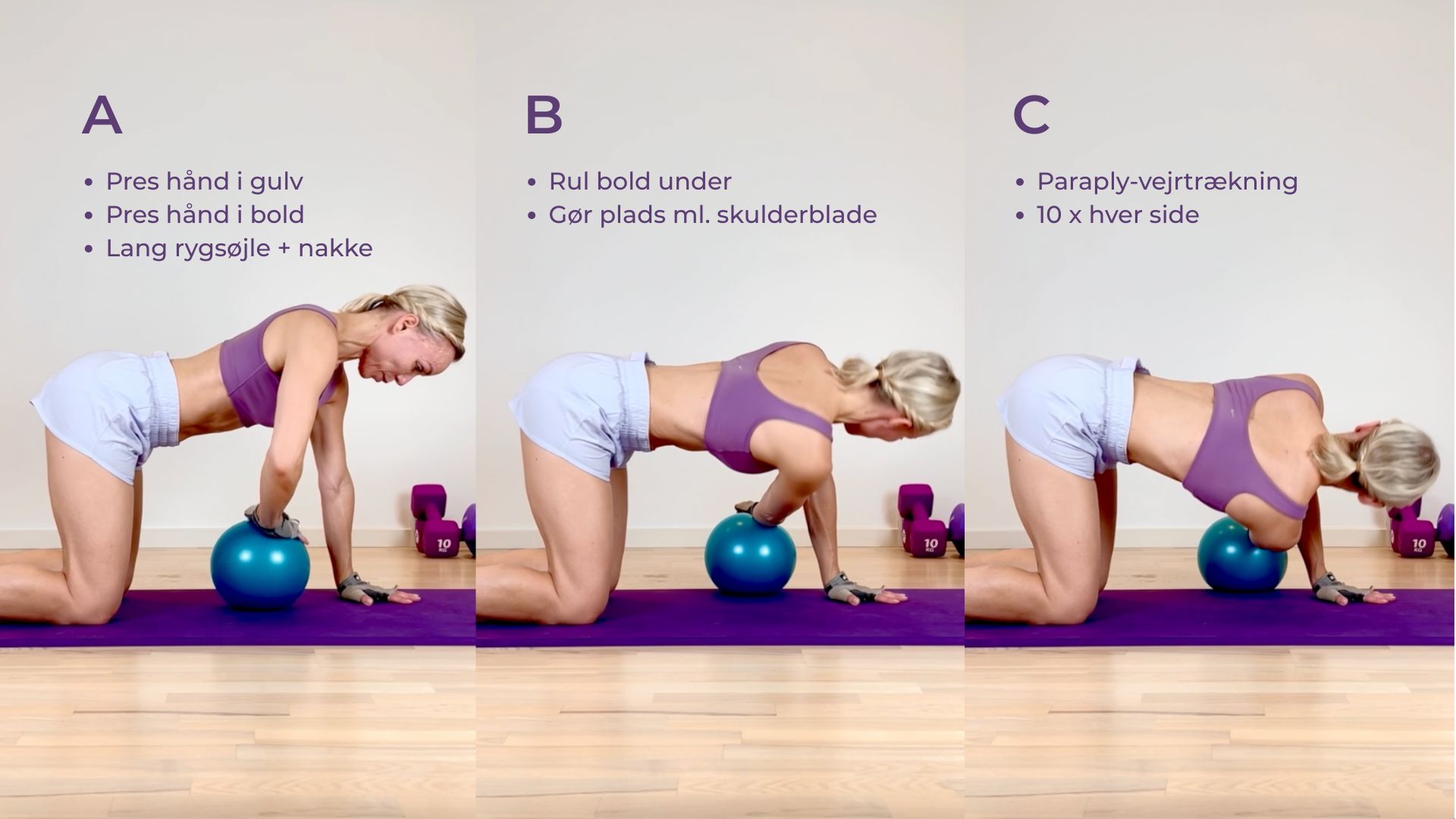Læg en lille pilatesbold (cirka 20-25 cm i diameter) under den ene hånd. Pres begge hænder ned mod gulvet – både den på bolden og den direkte på gulvet.